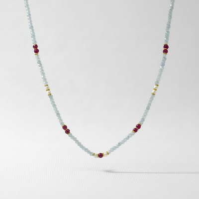 18ct Gold Vermeil Aquamarine Ruby Pearl Beaded Necklace
