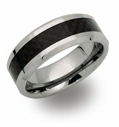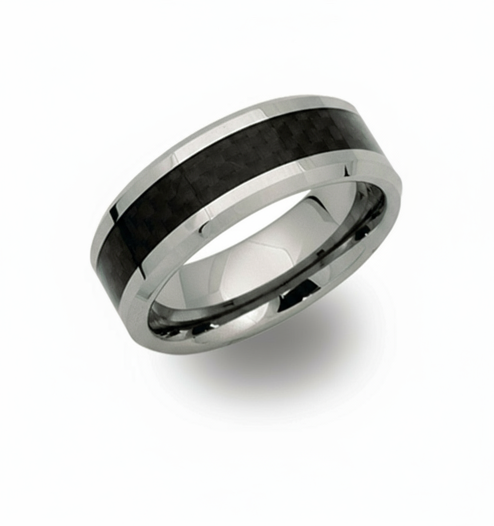 Make a statement with this bold tungsten ring with black carbon fibre inlay in a flat court design. A stylish addition to your jewellery collection.